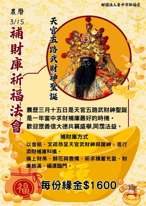 本宮訂於 農曆三月十五日(國曆5月1日) 舉辦 天官五路武財神聖誕 補財庫祈福法
